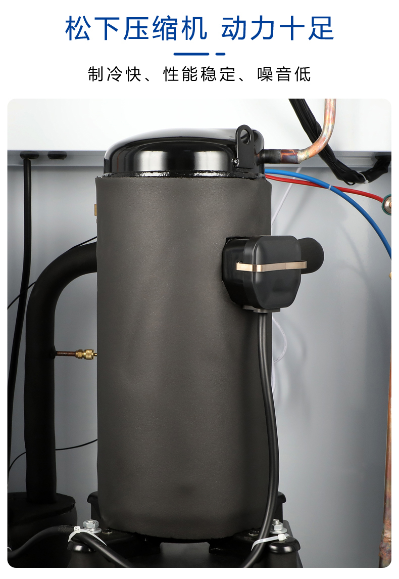 8.性能穩(wěn)定,質(zhì)量可靠,采用的品牌數(shù)碼渦旋壓縮機降溫能力強,噪音低,效率高。