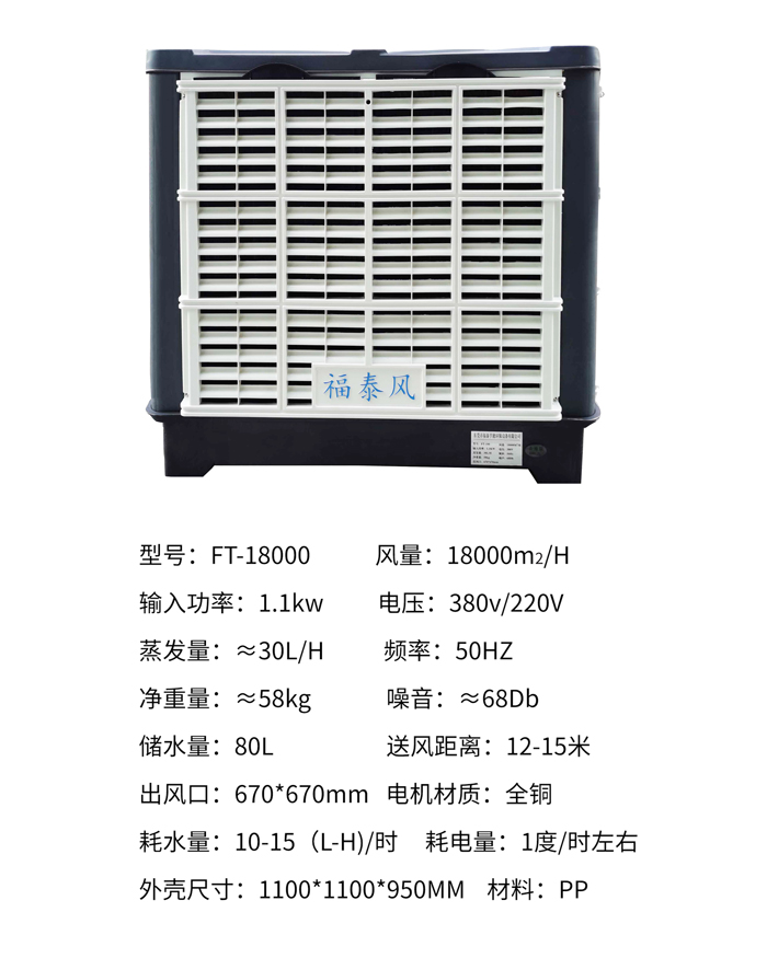 福泰環(huán)保空調(diào)性能穩(wěn)定在越炎熱的天氣下降溫的效果越好。適用于開(kāi)敞式及半開(kāi)敞式環(huán)境,能夠直接輸送自然風(fēng)及輸送降溫后的涼風(fēng)。室外新鮮空氣經(jīng)福泰蒸發(fā)式冷氣機(jī)過(guò)濾、降溫后向室內(nèi)源源不斷的大量輸送,將室內(nèi)帶有異味、粉塵和混濁悶熱的空氣排出室外,同時(shí)兼顧換氣降溫及增加空氣含氧量等多種效果。